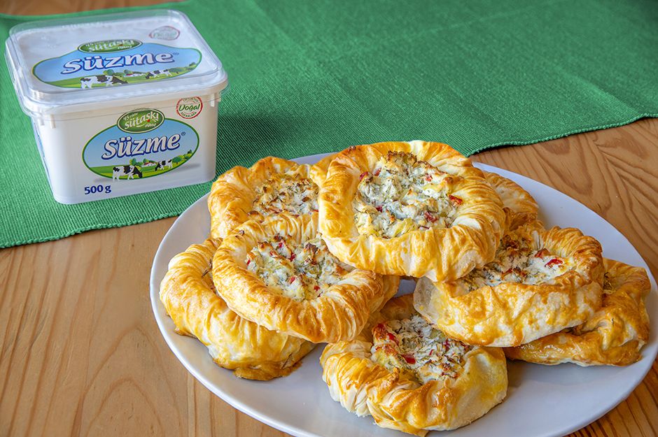 Yapılışı: Bir kasede süzme peyniri çatal yardımıyla ezin. Üzerine küçük doğranmış biberleri ve kıyılmış dereotu ile maydanozu ekleyip güzelce karıştırın. Tereyağını eritin ve üzerindeki köpüğü alın. Yumurta ile sodayı bir kasede karıştırın. Yufkaları tezgaha üst üste açın. Artı şeklinde kesip büyük üçgenler elde edin. Büyük üçgen yufkalara fırça yardımıyla yumurtalı soda karışımından sürün. Bu noktada yufkayı çok ıslatmdan nemlendirecek kadar sürmeye dikkat edin. Ardından eritilmiş tereyağını yufkaların her yerine gelecek şekilde sürün. Üçgen yufkaların her birini, uç kısmından yaklaşık 4 parmak dışarda kalacak şekilde oklavaya sarın ve sarılmış olan yufkanın iki kenarından orta kısmına doğru iterek büzgü oluşturun. Büzgü olan iki ucu nazikçe dışarıda kalan yufkaya doğru getirerek bir yuvarlak oluşturun ve kürdan yardımıyla sabitleyin. Hazırladığınız yufkaları pişirme kağıdı serili fırın tepsisine yerleştirin. Orta kısımlarına peynirli harcı eşit olarak yayın. Yufkaların üzerine yumurta sarısı sürün ve 180 dereceye ayarladığınız fırında kontrollü olarak 15-20 dakika pişirin. Sıcak olarak servis edin.