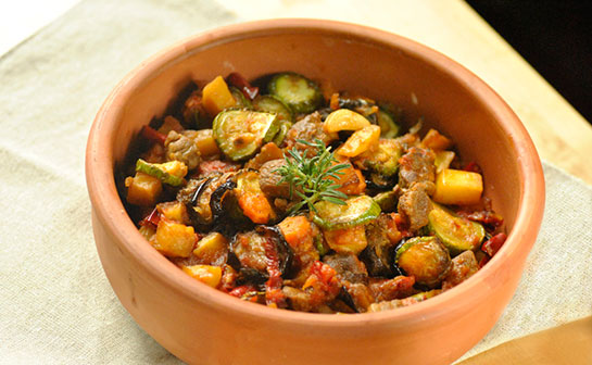 Malzemeler 400 gr kuşbaşı kuzu eti 3 adet soğan 2 adet patlıcan 2 adet kabak 3 adet domates 3 adet patates 5 adet sivri biber 2 tatlı kaşığı tereyağı 2 çay kaşığı toz kırmızıbiber 1/2 çay kaşığı karabiber 1 çorba kaşığı biber salçası 5 diş sarımsak tuz
