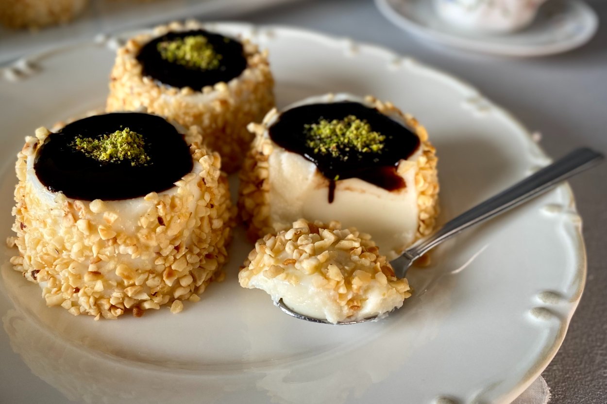 Yapılışı: Tencereye yağ ve vanilin hariç tüm malzemeleri koyup orta ateşte karıştırın. Koyulaşan muhallebinin altını kapatın.Tereyağ ve vanilin ekleyerek karıştırmaya devam edin. Muhallebeyi dökeceğiniz bardakları ıslatın. Bu şekilde muhallebi bardaktan kolay çıkacaktır. Muhallebiyi eşit şekilde bardaklara paylaştırın. Oda sıcaklığına gelene kadar bekletin. Sonrasında üzerlerini streçle kapatıp buzdolabına kaldırın. En az 3-4 saat bekletin. Süre sonunda kıvam alan muhallebiyi bardaktan çıkarmak için elinizle bastırarak hava almasını sağlayın. Bardaktan çıkardığımız muhallebiyi ikiye kesin.Kenarlarını fındık kırığına bulayın.Çikolata sosunu paketin arkasında yazan şekilde hazırlayın. Dilerseniz benmari usulü çikolata da eritebilirsiniz. Ardından üst kısımlarına sosu gezdirin ve servis edin.