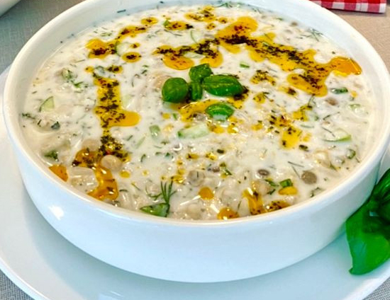 Yoğurdu uygun bir kaseye alalım iyice çırpalım haşlanmış soğumuş bakliyatları ilave edelim, nane, sarımsağı ekleyelim küçük doğranmış salatalığı ekleyelim.